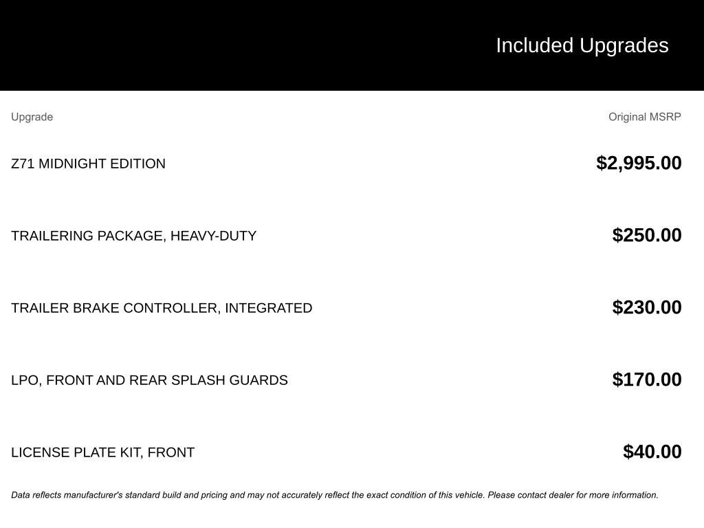 ⢠Z71 MIDNIGHT EDITION package with black bowties, body-color grille, spray-on bedliner, and 17-inch gloss-black aluminum wheels