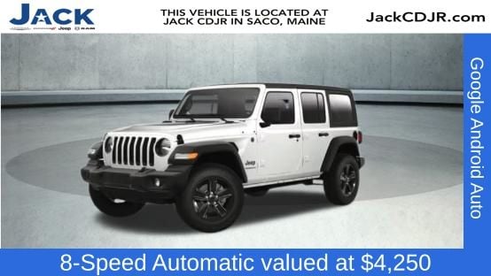 Stepping inside, you'll be greeted by a spacious and well-appointed interior, featuring comfortable cloth low-back bucket seats and a host of advanced technologies to keep you connected and entertained. The Wrangler's signature style is enhanced by the sleek, white exterior, making it a head-turning presence wherever you go.