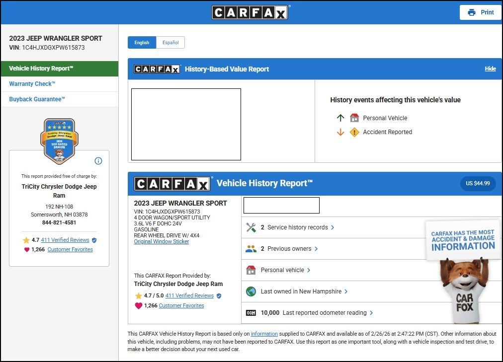 This Wrangler Sport is powered by a robust 3.6L V6 24V VVT engine, delivering a thrilling driving experience with 4-wheel drive capabilities. Boasting an impressive 19 MPG in the city and 24 MPG on the highway, this Jeep offers the perfect balance of off-road prowess and fuel efficiency.