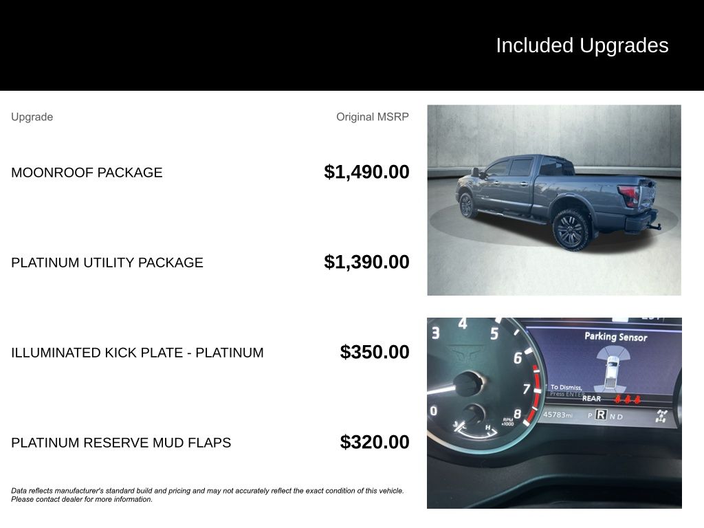 The Titan XD Platinum Reserve is more than just a truckâ"it's a statement of refined power and capability. With its impressive towing and hauling capacities, this vehicle is ready to tackle any job or adventure with ease. And with the added convenience of features like the Titan Box, Rear Utility Bed Step, and Electronic Locking Tailgate, you'll have the tools to get the job done right.