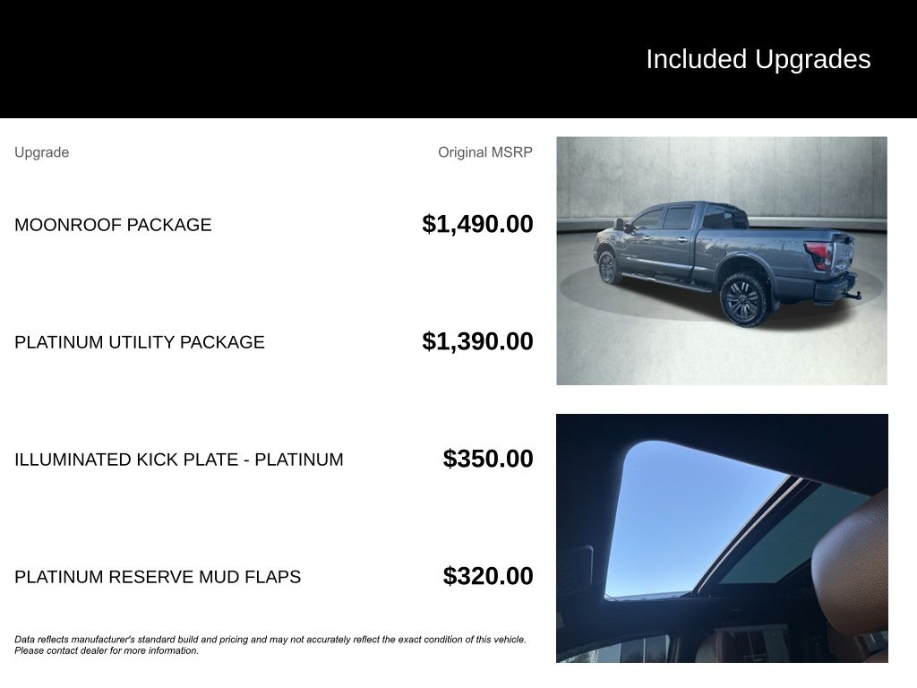 Designed to impress, the Titan XD Platinum Reserve exudes a bold and sophisticated presence. The sleek Gray exterior accentuates the truck's muscular lines, while the Dark Painted & Machined Clad 20-inch wheels add a touch of rugged elegance. Step inside and you'll be enveloped in a cabin of unparalleled comfort and convenience, with premium Leather Seat Trim, Heated and Cooled Captain's Seats, and a Heated Steering Wheel.