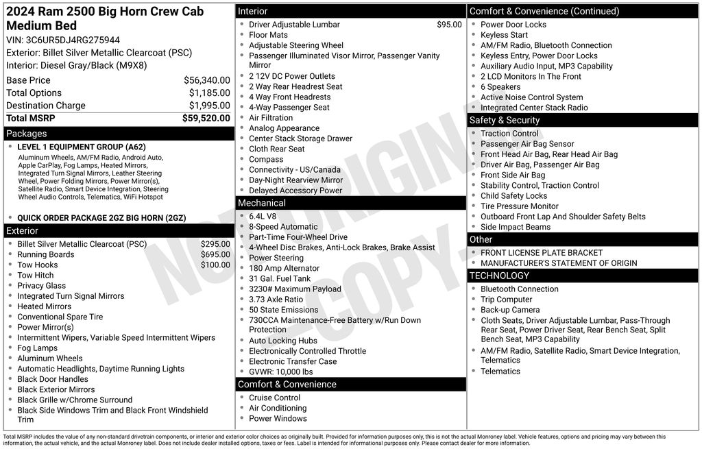 Beyond these standout features, the 2024 Ram 2500 Big Horn is packed with a wealth of premium amenities to elevate your driving experience. Enjoy the convenience of GPS Antenna Input, Integrated Center Stack Radio, and SiriusXM Satellite Radio, as well as the comfort of Air Conditioning and Remote Keyless Entry. Safety is also a top priority, with features like Traction Control, 4-Wheel Disc Brakes, and ParkView Rear Back-Up Camera keeping you and your passengers secure.