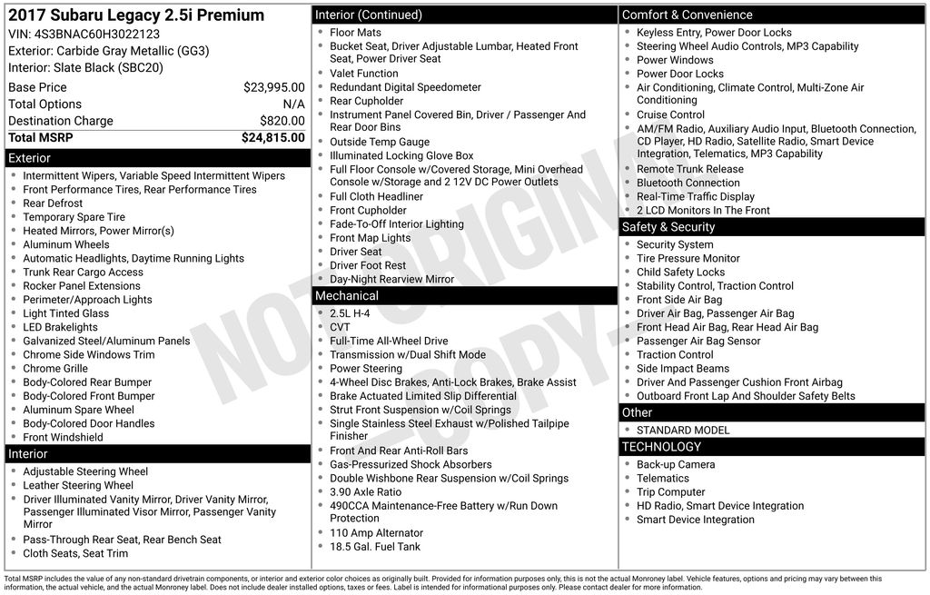 Whether you're commuting to work, embarking on a road trip, or navigating the challenges of daily life, this 2017 Subaru Legacy 2.5i Premium is the perfect companion. With its impressive fuel efficiency, boasting 25 mpg in the city and 34 mpg on the highway, you can enjoy the journey without worrying about frequent stops at the pump.