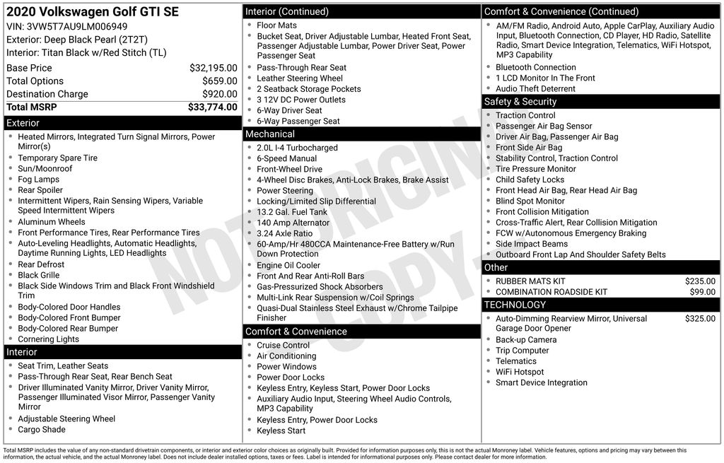 Boasting a 2.0L TSI DOHC engine mated to a smooth 6-speed manual transmission, the Golf GTI offers a thrilling 24 city/32 highway MPG, ensuring you can enjoy the ride without sacrificing efficiency. Complementing its potent powertrain, the Golf GTI's sleek black exterior and bold styling cues turn heads wherever you go.