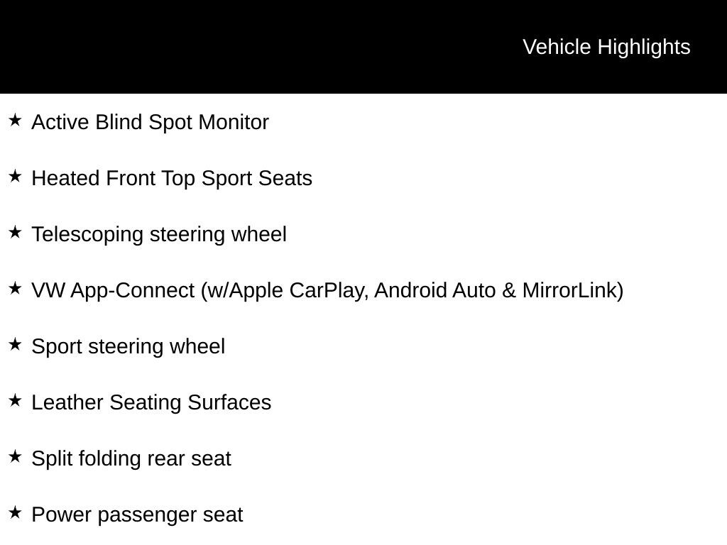 - Smart device integration: VW App-Connect (w/Apple CarPlay, Android Auto & MirrorLink)
